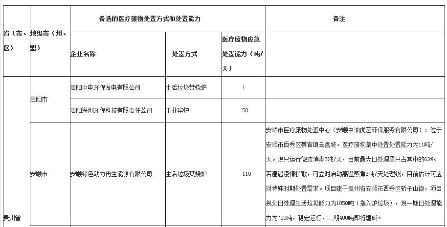 貴州省應(yīng)對(duì)新型冠狀病毒感染的肺炎疫情30家醫(yī)療廢物處置企業(yè)和6家備選的疫情應(yīng)急醫(yī)療廢物處置企業(yè)名單
