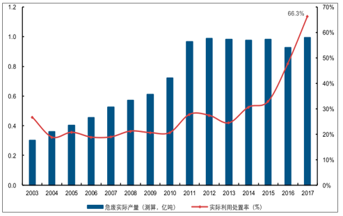 2003-2017年中國(guó)危廢實(shí)際產(chǎn)生量預(yù)測(cè)及處置率