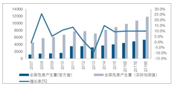 ? ? 2015年全國危廢產生量為3976萬噸,但是由于該數據來源于企業自主申報,明顯低于實際產生量。2007年危廢的產生量為4574萬噸,大幅高于當年《統計年報》所統計的數字1079萬噸。污染源普查公告的數字接近真實值,其與企業自主申報值得比值為4.24。由于2011年危廢申報下限由10kg下降至1kg,危廢當年的自主申報產生量大幅上升至3431萬噸,假設當年實際危廢增長率與前三年復合增長率相同,則當年實際估測危廢產量為7651萬噸,實際估測值與申報值之間比值下降為2.23,進一步假設此后該比例都相同,則預測2018年全國危廢的實際產量在1.18億噸。而行業內一般認為實際危廢產量在一億噸左右。