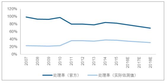 ? ? 從處理量的角度看,2015年危廢處理量為1207萬噸,綜合利用量為2079萬噸,這部分危廢通過正規渠道進行了處理,并且數據相對真實。據此測算,當年危廢處理率為37.08%,也就是說全國還有5578萬噸的危廢通過不正規渠道進行處理。