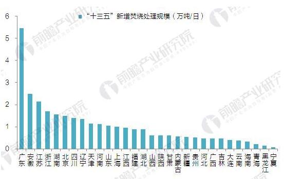 ? ? 從新增發(fā)電能力來看,“十三五”時期廣東省將新增焚燒處理能力5.46萬噸/日,年復(fù)合增速達(dá)31.84%。其次為安徽、江蘇、浙江,“十三五”期間分別新增2.49萬噸/日、2.15萬噸/日、1.69萬噸/日,年復(fù)合增速分別為32.56%、18.53%、17.51%。