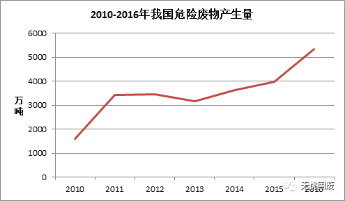 ? ? 工業(yè)行業(yè)是我國危險(xiǎn)廢物的主要來源,根據(jù)2017中國統(tǒng)計(jì)年鑒顯示,2016年全國工業(yè)危險(xiǎn)廢物產(chǎn)生量為5347.3萬噸,同比增長34.49%。