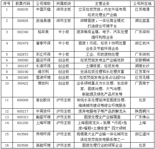 ? ? 在環(huán)保各子行業(yè)中,固廢處理行業(yè)具有投入大、周期長、回報(bào)穩(wěn)定的特點(diǎn)。本人對(duì)A股16家固廢處理行業(yè)上市公司進(jìn)行了整理,具體公司情況如下表: