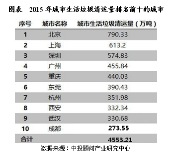 ? ? 在全國661個設市城市中,生活垃圾清運量前三名的城市分別為北京市、上海市和深圳市,分別為790.33萬噸、613.2萬噸和574.83萬噸。前十名城市的生活垃圾清運量達4553.21萬噸,占全國城市生活垃圾清運量的23.79%。排名前十的城市垃圾清運量見下表。