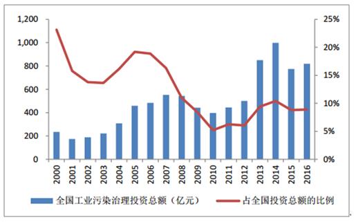 2000-2016年工業污染治理投資總額及其占比
