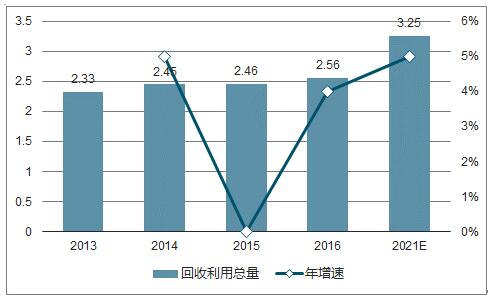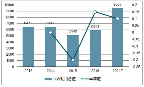 ? ? 十大廢棄物回收利用量變化相對穩定,年增速在0%-5%,回收利用總值受大宗商品價格變化而波動較大。2016年,我國十大類別的再生資源回收總量約為2.56億噸,同比增長3.7%,回收總值約為5902.8億元,同比增長14.7%。預計到2021年,我國主要再生資源利用總量將達到3.25億噸,復合增速5%,再生資源回收價值達到9506.52億元,復合增速10%。