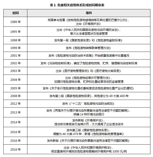 ? ? 至2017年,危險廢物治理法規體系日趨完善。體系形成的最大標志之一是危廢監管力度加大。2017年5月,環保部發布《“十三五”全國危險廢物規范化管理督查考核工作方案》,提出建立分級負責考核機制,以省(區、市)為主組織考核,國家對全國的規范化管理情況進行抽查。在落實主體責任的前提下,進一步加強危廢監管。