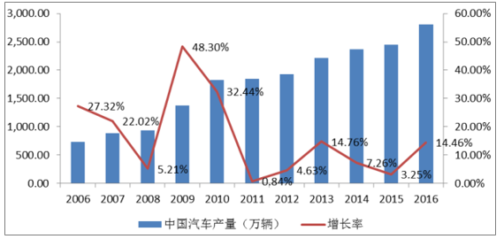 ? ? 近年來(lái),以中國(guó)為代表的發(fā)展中國(guó)家的汽車行業(yè)發(fā)展迅速,從 2001年到 2008年,中國(guó)汽車工業(yè)產(chǎn)銷平均每年跨越一個(gè) 100 萬(wàn)輛臺(tái)階。2009 年我國(guó)新車產(chǎn)銷量躍居世界第一,并保持至今,汽車工業(yè)已毫無(wú)爭(zhēng)議地成為我國(guó)國(guó)民經(jīng)濟(jì)的支柱產(chǎn)業(yè)。中國(guó)的汽車產(chǎn)量在 2014 年、2015 年和 2016 年分別為2,372.29 萬(wàn)輛、2,450.33 萬(wàn)輛、2,811.88 萬(wàn)輛,同比分別增長(zhǎng) 7.26% 、3.25% 和14.46%。