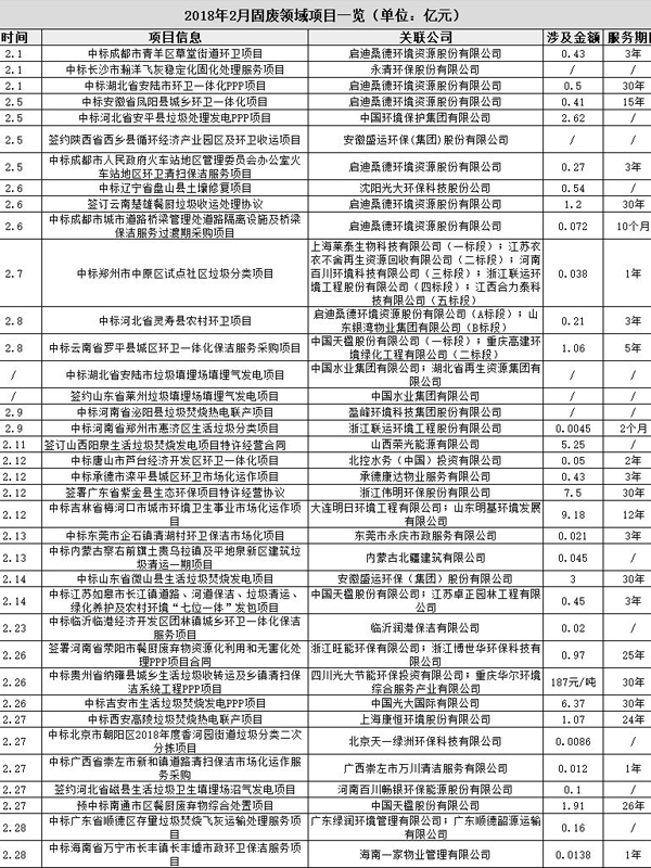 ? ? 據(jù)中國固廢網(wǎng)不完全統(tǒng)計,2018年1月固廢領域落地的項目高達55個,涉及總金額逾120億元(詳情請點擊:1月固廢市場盤點:55個項目落定,涉及金額逾120億元)。2018年2月,即使處在春節(jié)放假期間,固廢領域落地的項目也足有37個,涉及金額超過43.91億元。其中包括垃圾分類項目3個、垃圾焚燒發(fā)電項目7個、環(huán)衛(wèi)項目15個、土壤修復項目1個、餐廚處理項目3個、垃圾清運項目3個、飛灰處理項目2個以及垃圾填埋場項目3個。另外,統(tǒng)計內(nèi),本月沒有釋放危廢處理項目。