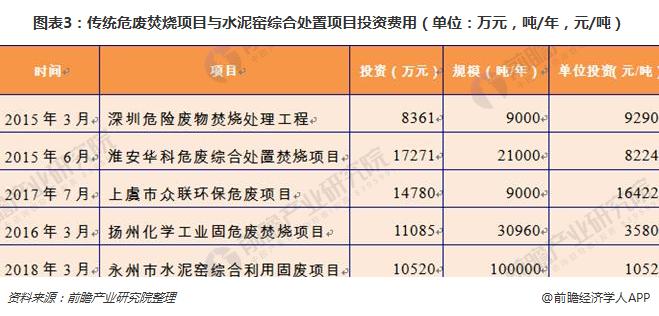 圖表3:傳統(tǒng)危廢焚燒項(xiàng)目與水泥窯綜合處置項(xiàng)目投資費(fèi)用(單位:萬元,噸/年,元/噸)